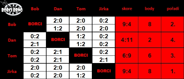 - porazil v jednom z utkání vítěze Boba. Čtvrté místo připadlo Danovi a bez bodu